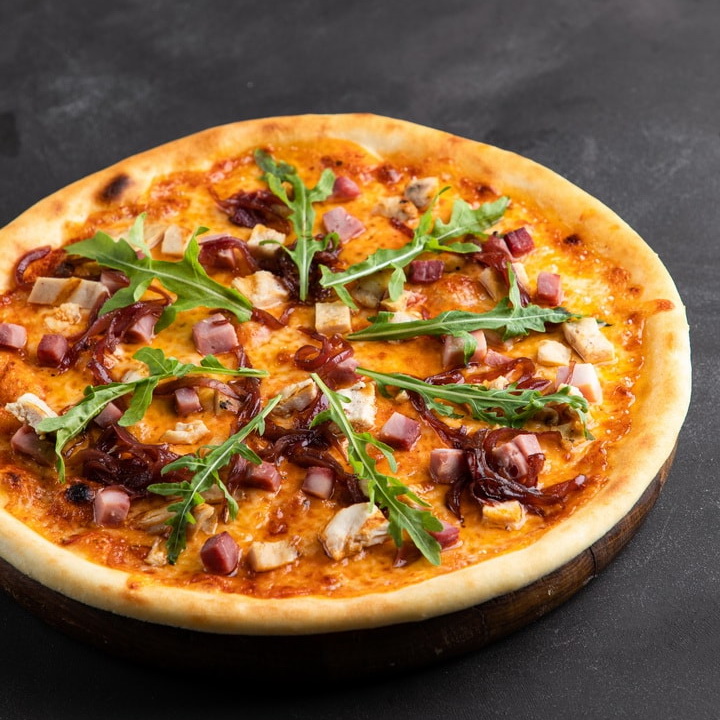 BBQ (томатный соус, курица, говяжья ветчина, карамелизированный лук, сыр, руккола)